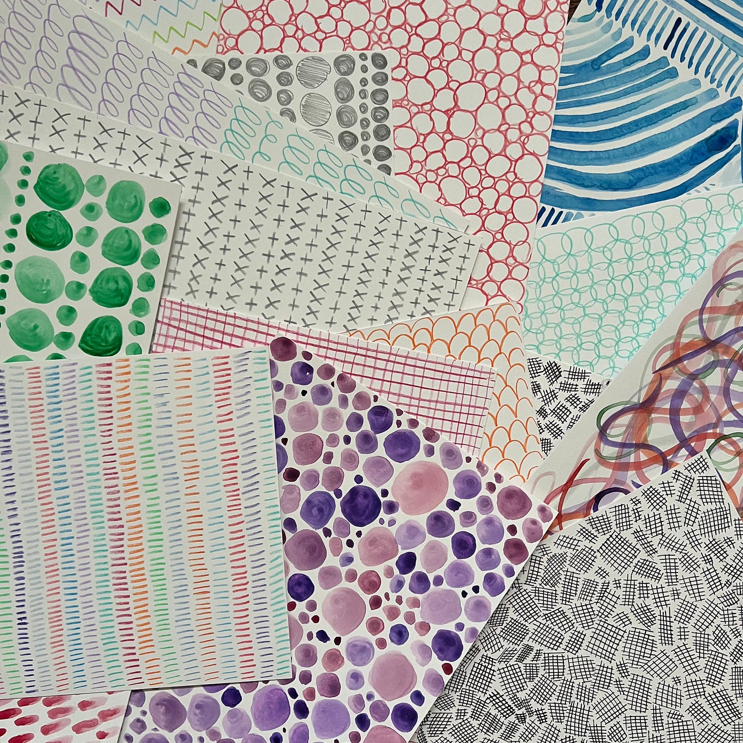 Staying true to my creative goals for the year, I started taking a Creativebug class led by the wonderful Lisa Congdon called, “Developing your visual vocabulary: A daily practice in mark making”. It is one of the most relaxing creative playing I’ve done in quite a while! Sitting down with colored pencils, watercolor, and fun pens to make repetitive marks on a page feels like a mini vacation for my brain. Something about it allows the thinking part of my mind to quiet down and a different part takes over. I still have many sessions to go because it is a 31 day class. I’m having a nagging urge to dabble in collage as well, so I will use these doodle pages as collage material and explore the CreativeBug classes in collage to fuel my interest.